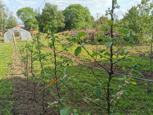 Die neu angelegte Obstanlage am Heumesserhof entwickelt sich prächtig – eine wahre Augenweide, die uns in den kommenden Jahren reichlich Ernte bescheren wird! Aber nicht nur das Obst gedeiht, auch unsere Lehr- und Seminargärtnerei wächst stetig. Auf der Freilandfläche haben wir bereits die ersten Kulturen angelegt: Erdäpfel, Buschbohnen, Zwiebeln, Zuckermais, Zucchini und Gurken.