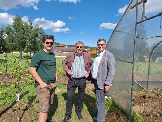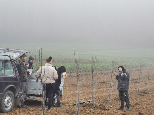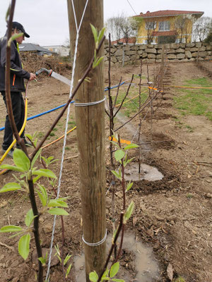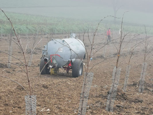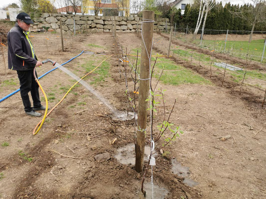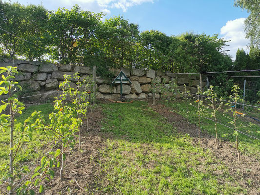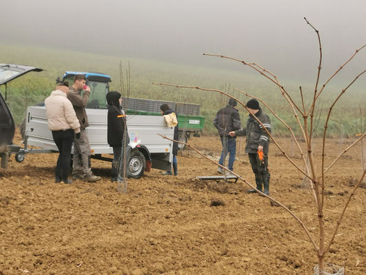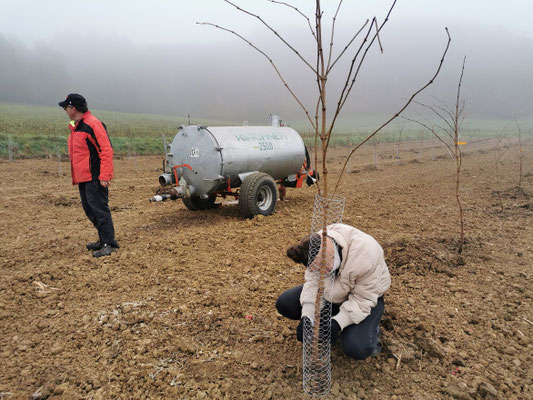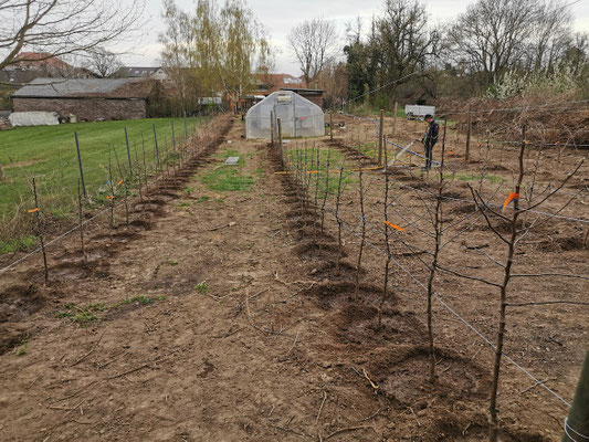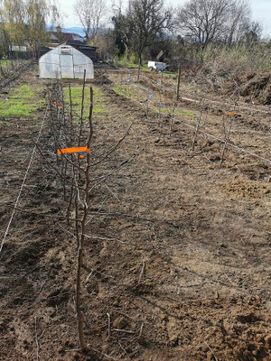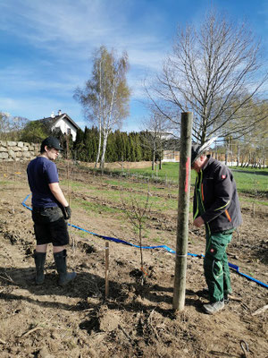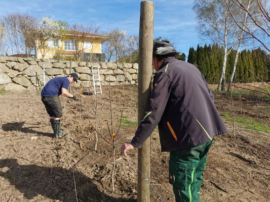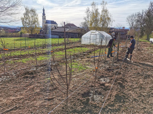 Nach drei Tagen harter Arbeit haben Josef und Emanuel insgesamt 160 kleine Spindelbäume gesetzt – darunter fünf Apfelsorten, mehrere Birnensorten, Pfirsiche und Nektarinen. Das Aufleitgerüst wurde sorgfältig gebaut, und die Bäumchen wurden gründlich eingegossen, damit sie gut anwachsen können.
