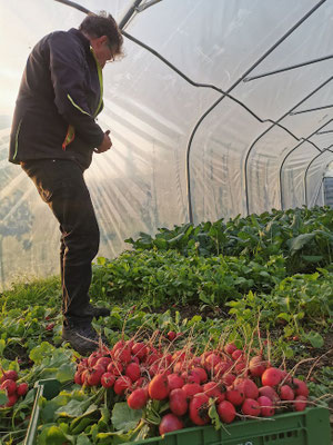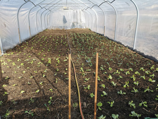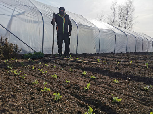 Die ersten Sonnenstrahlen – Jetzt beginnt die Gartensaison! Endlich ist es so weit: Die ersten warmen Sonnenstrahlen kündigen den Frühling an! Die Tage werden länger, die Temperaturen steigen – jetzt ist die perfekte Zeit für Gärtnereiarbeit. Im Folientunnel ist schon einiges passiert: Wir haben fleißig Salat, Kohlrabi, Radieschen und Karotten gepflanzt und gesät. Die ersten Reihen stehen ordentlich da und versprechen eine reiche Ernte.