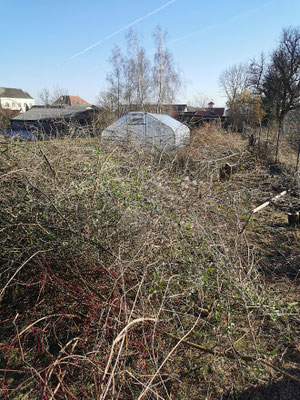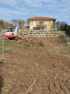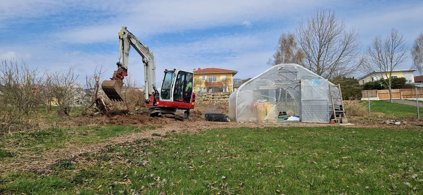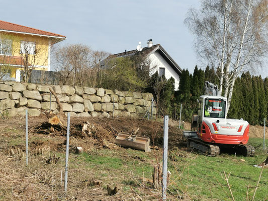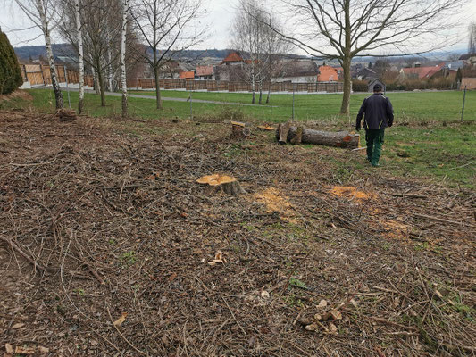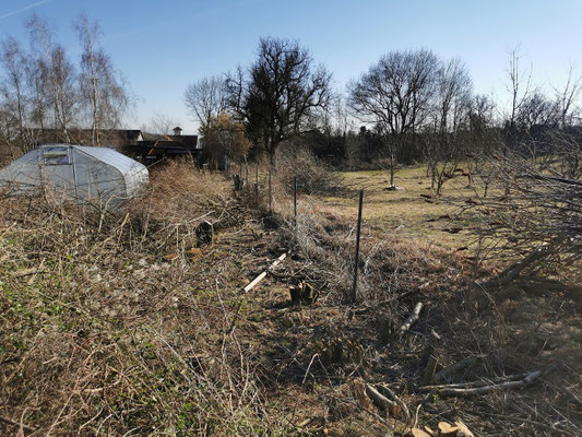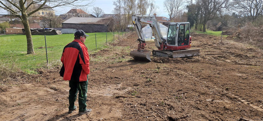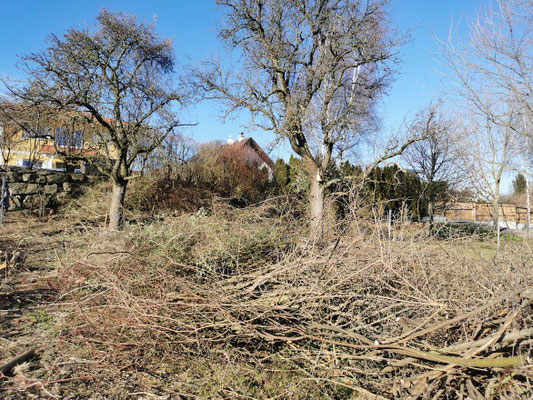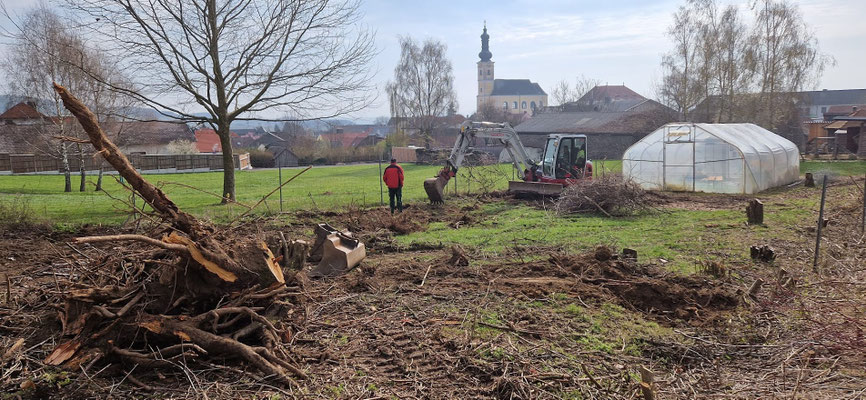 Alle Bäume und Sträucher sind nun umgeschnitten, und der nächste Schritt steht kurz bevor: Der Bagger rückt an, um die Wurzelstöcke auszubaggern. Danach wird die gesamte Fläche begradigt und für die jungen Obstbäume vorbereitet.