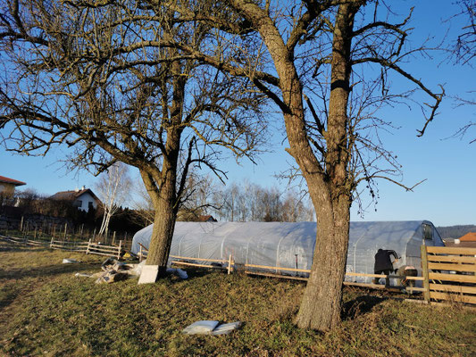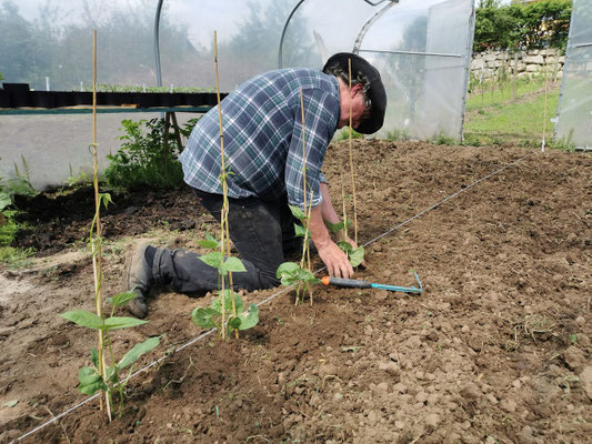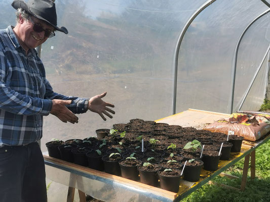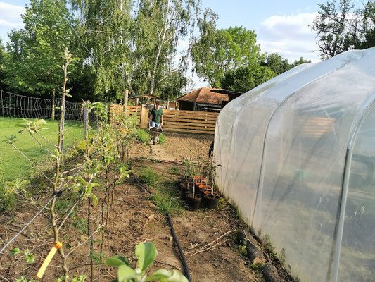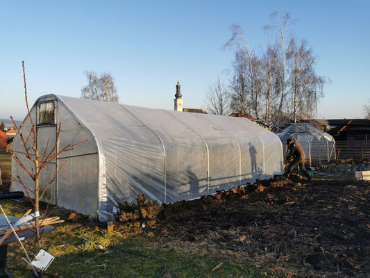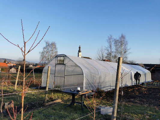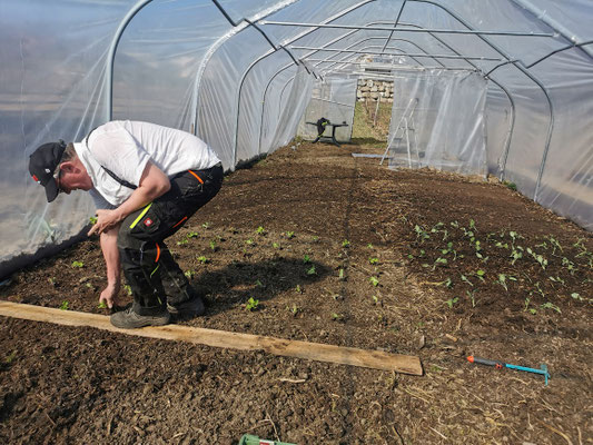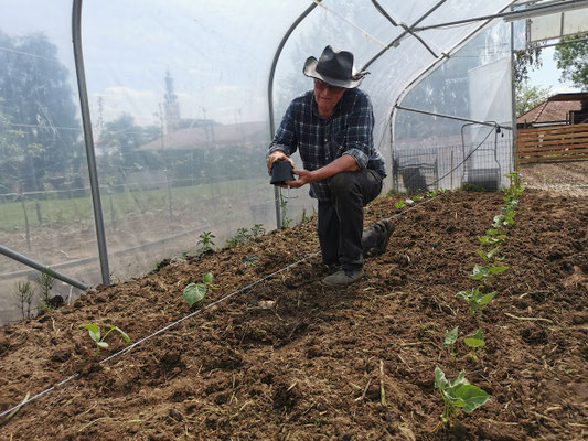Im Folienhaus hat Josef zwei Sorten Gurken und Stangenbohnen gesetzt. Unsere selbstgezogenen Jungpflanzen wie Paradeiser, Pfefferoni und Paprika werden noch in den Anzuchttöpfen gepflegt und finden in etwa zwei Wochen ihren Platz im Folienhaus.