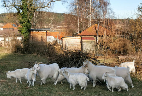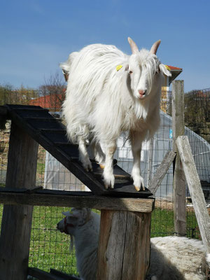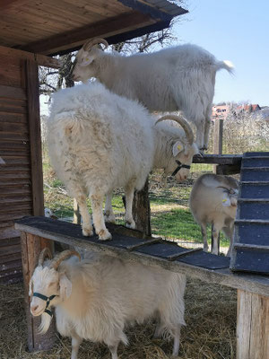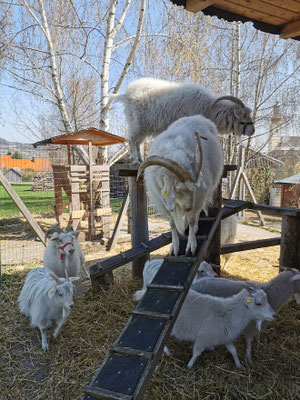 Mittlerweile haben wir mit unserer gesamten Kaschmirziegenherde bereits erste Ausflüge auf die Weide unternommen. Seit einer Woche gehen wir bei Schönwetter täglich mit der gesamten Herde vom Stall hinauf in den Tagesauslauf. Was für unsere 4 Kaschmirziegenbuben bereits bestens bekannt ist, mussten die Neuen erst langsam kennenlernen und entdecken. Anfangs waren sie etwas unruhig und verunsichert, doch mittlerweile genießen auch sie das große Gehege und die vielen Klettermöglichkeiten in vollen Zügen. Es ist schön zu sehen, wie sich die Herde immer mehr eingewöhnt und die Freiheit auf der Weide zu schätzen weiß