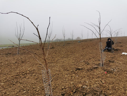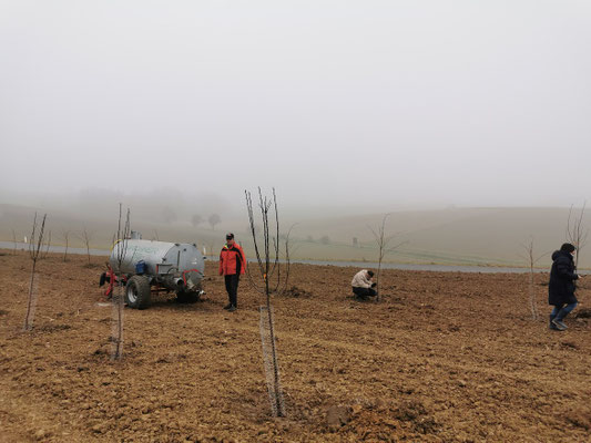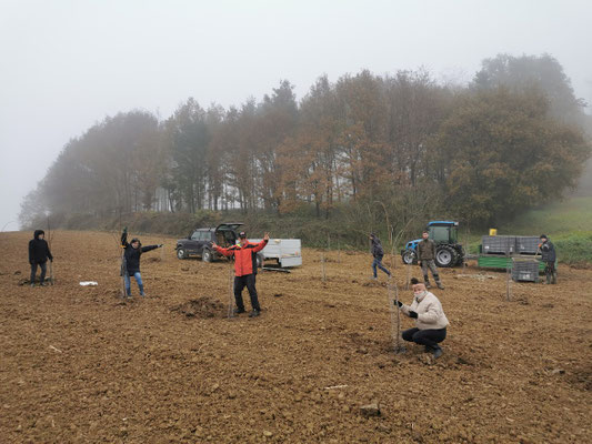 Wir freuen uns auf die erste Ernte bereits im kommenden Jahr! Doch nicht nur die Bäume stehen im Mittelpunkt – zwischen den Baumreihen wird noch Blumenwiesensamen eingesät, um eine kleine Biodiversitätsfläche für heimische Insekten, Schmetterlinge und Vögel zu schaffen.
