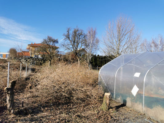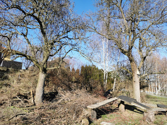 Die Rodungsarbeiten im hinteren Garten sind fast abgeschlossen. Leider müssen wir uns auch von den beiden alten Birnbäumen verabschieden. Aufgrund ihres hohen Alters sind sie bereits morsch und stellen eine Gefahr dar. Es ist traurig, aber gleichzeitig schafft es auch Platz für Neues.