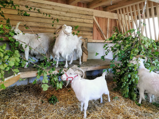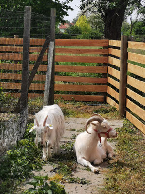 Mit viel Liebe und Handarbeit haben Emanuel und Josef einen neuen Zaun aus Lärchenholz gebaut, der das Tagesgehege nun umschließt. Auf einer Fläche von ca. 130 m² bieten sich den Ziegen zahlreiche Möglichkeiten zum Kraxeln, Ausruhen, Laufen und natürlich zum Fressen – ganz nach ihrem natürlichen Bedürfnis! Unsere Kaschmirziegen genießen nun mehr Freiheit und Platz, um ihren Tag in vollen Zügen zu verbringen.